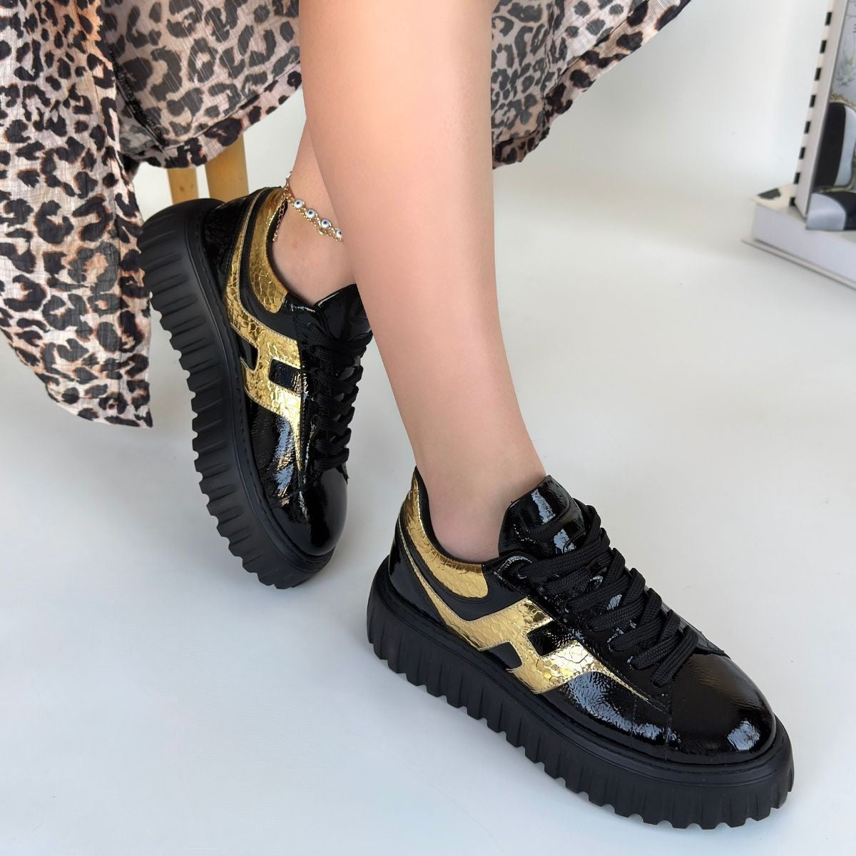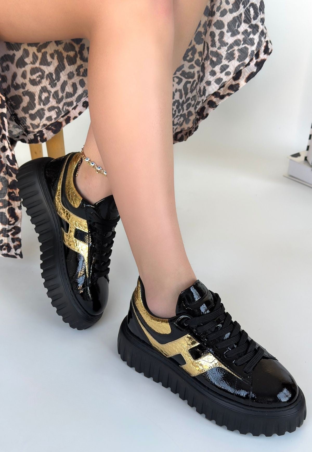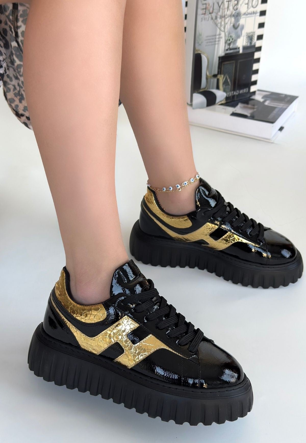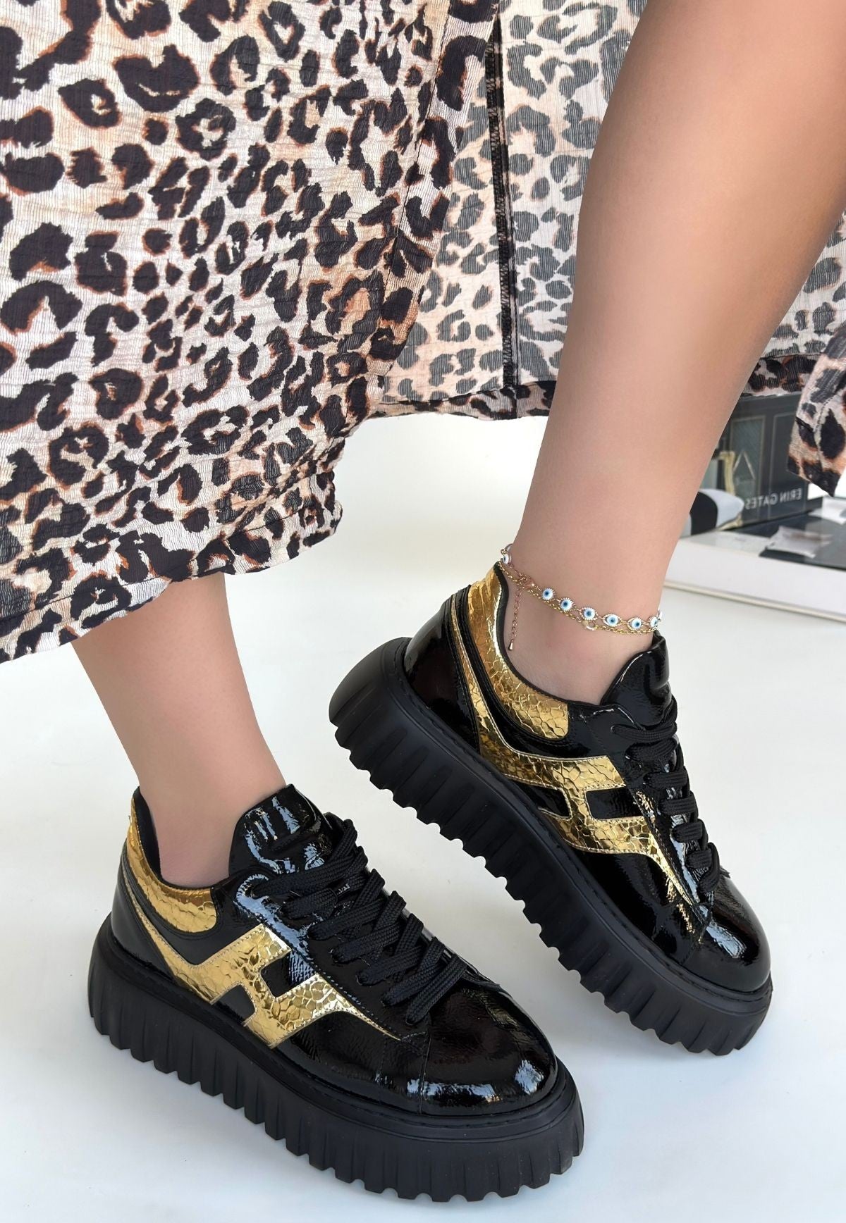 Gesti Siyah Rugan Altın Detaylı Bağcıklı Spor Ayakkabı