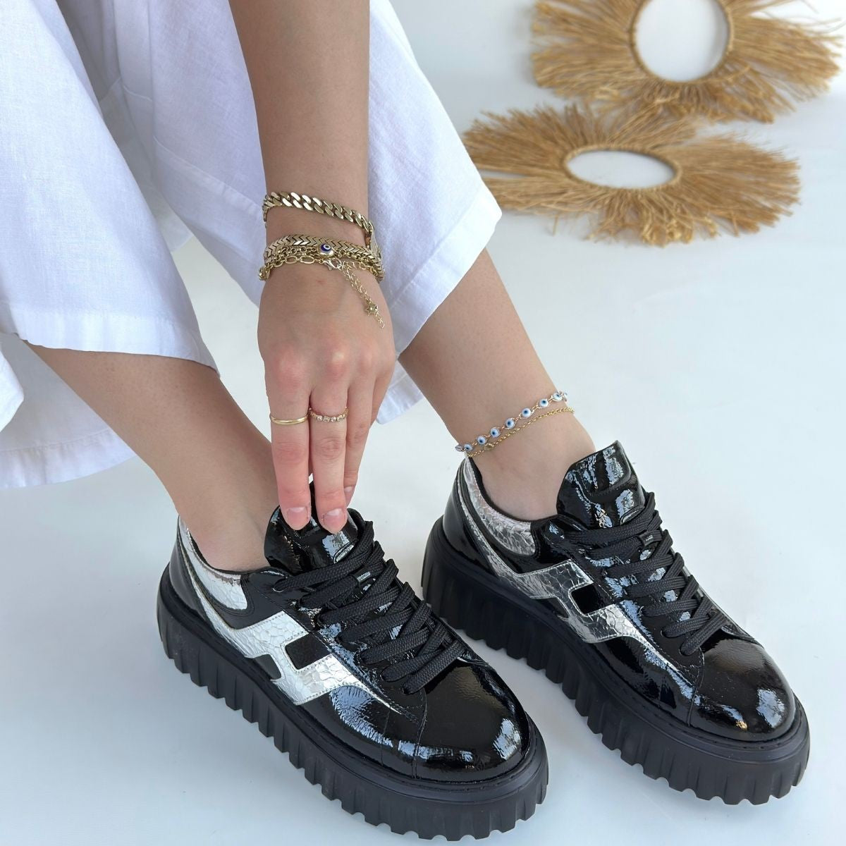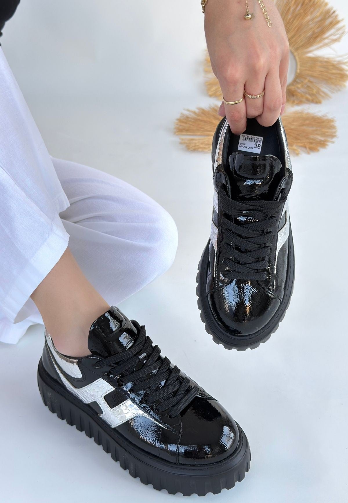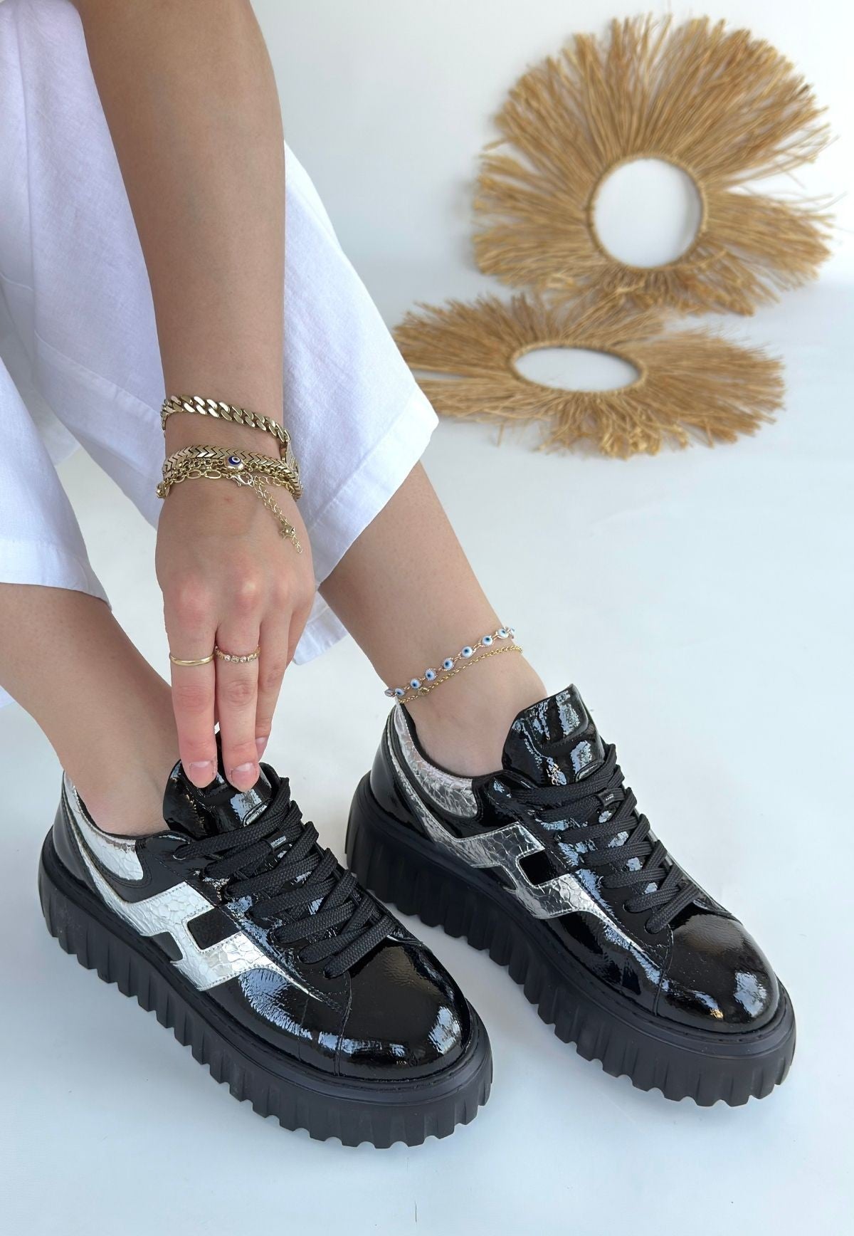 Gesti Siyah Rugan Gümüş Detaylı Bağcıklı Spor Ayakkabı