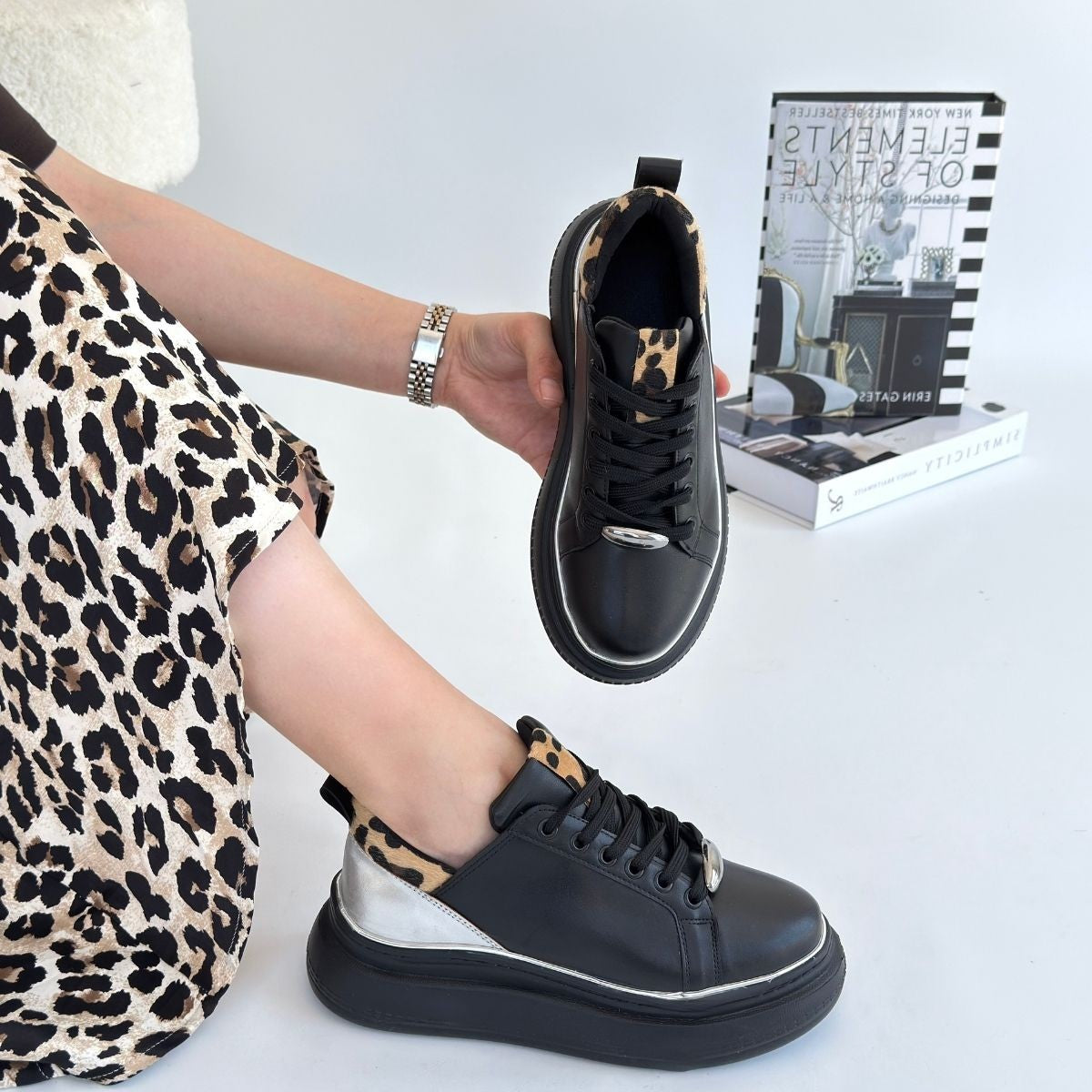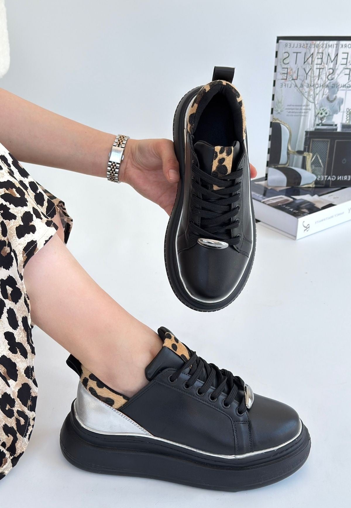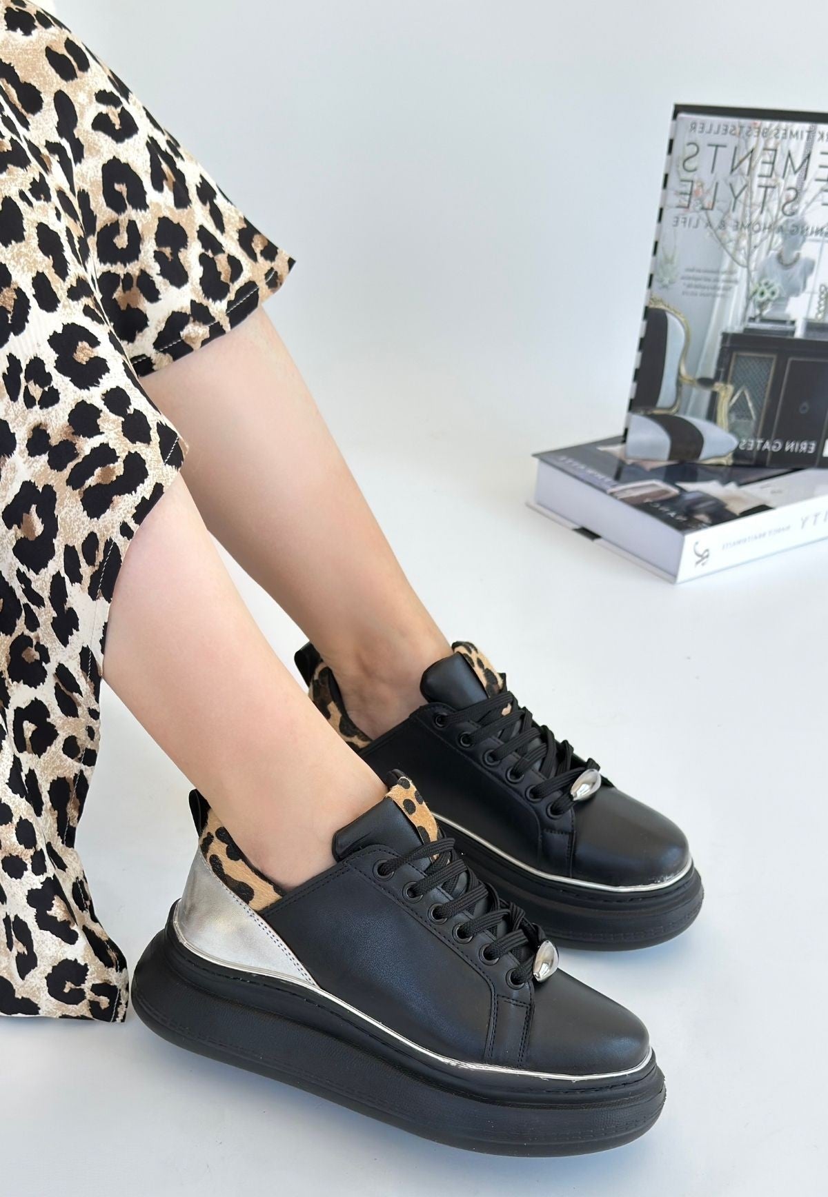 Jista Siyah Cilt Gümüş Detaylı Bağcıklı Spor Ayakkabı
