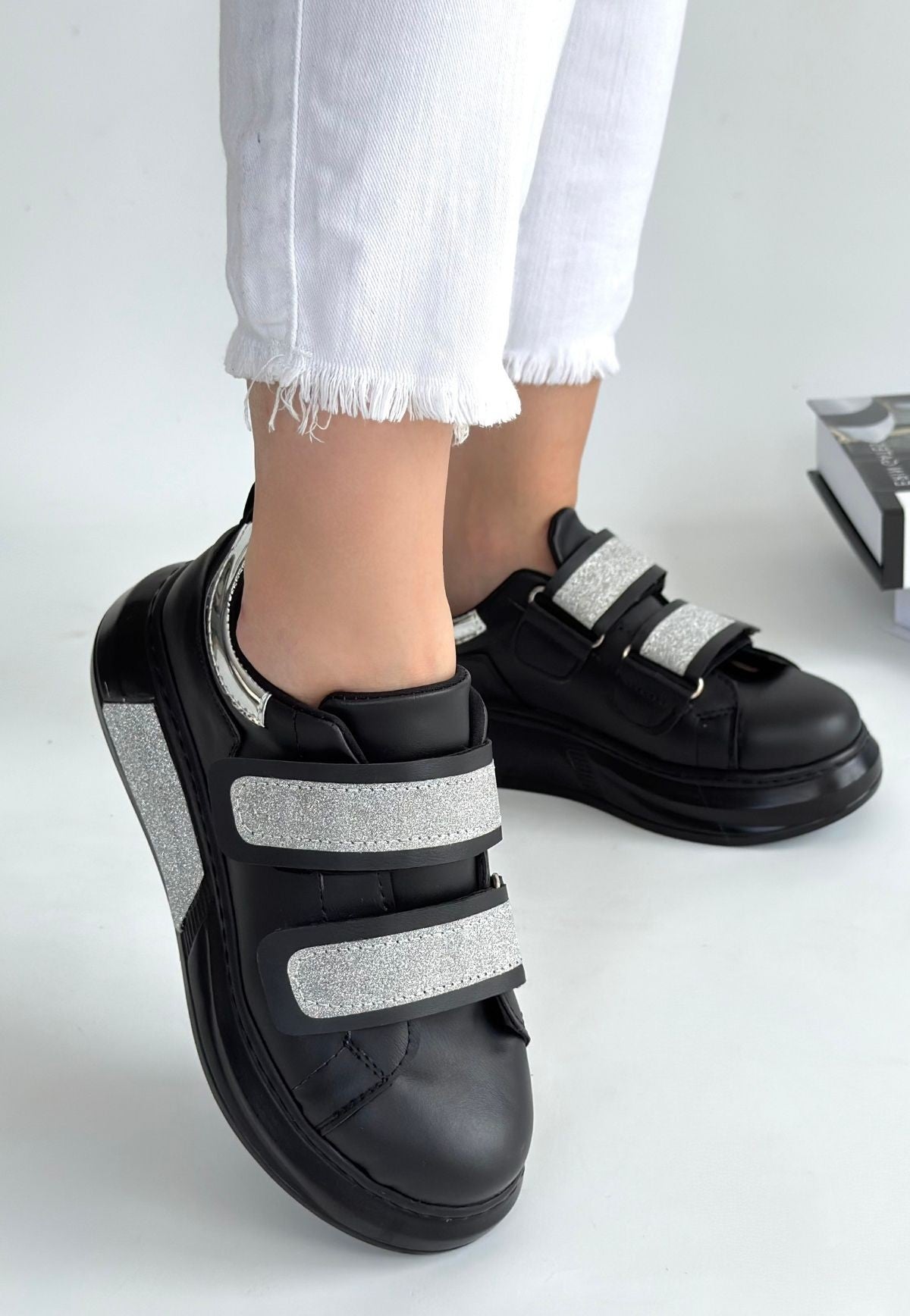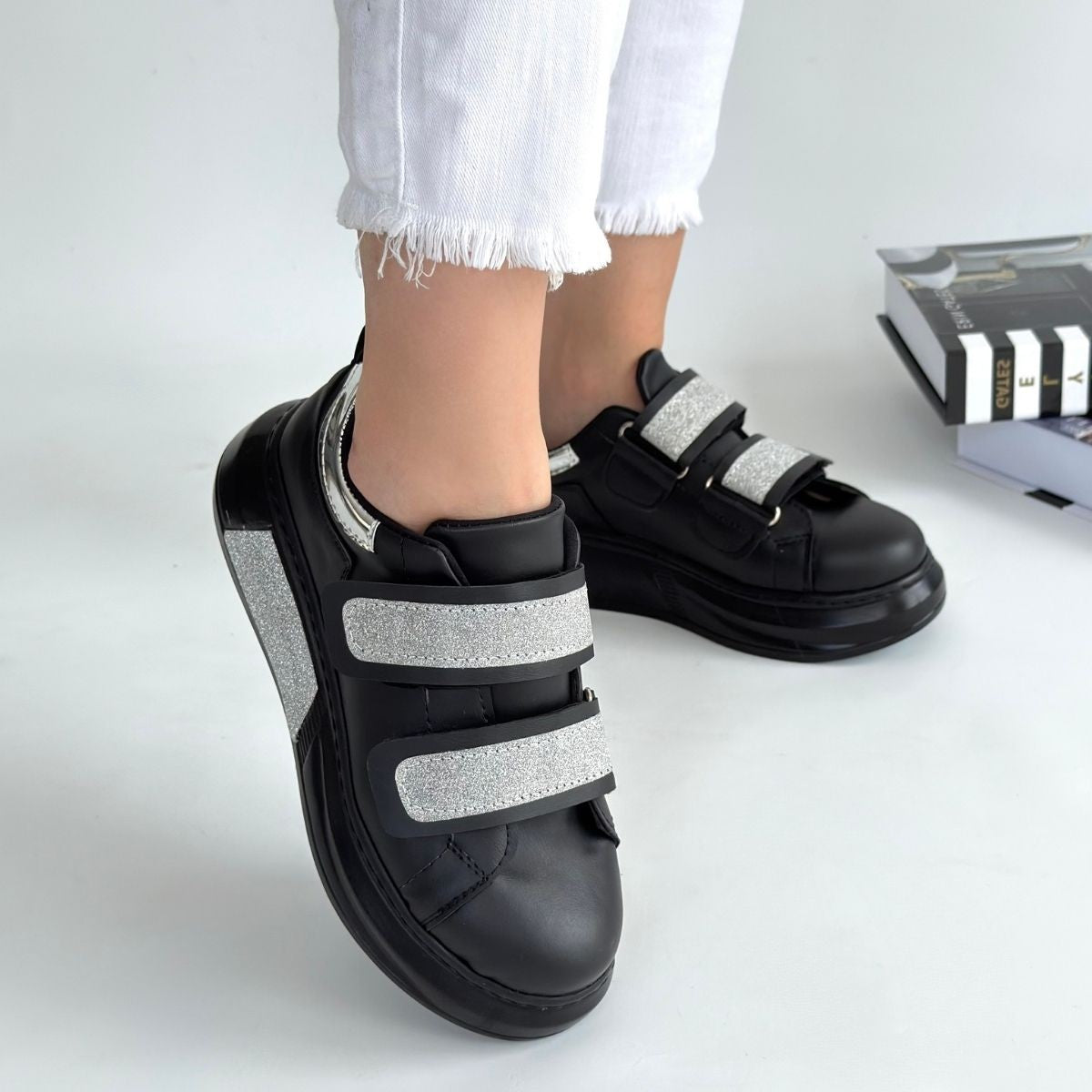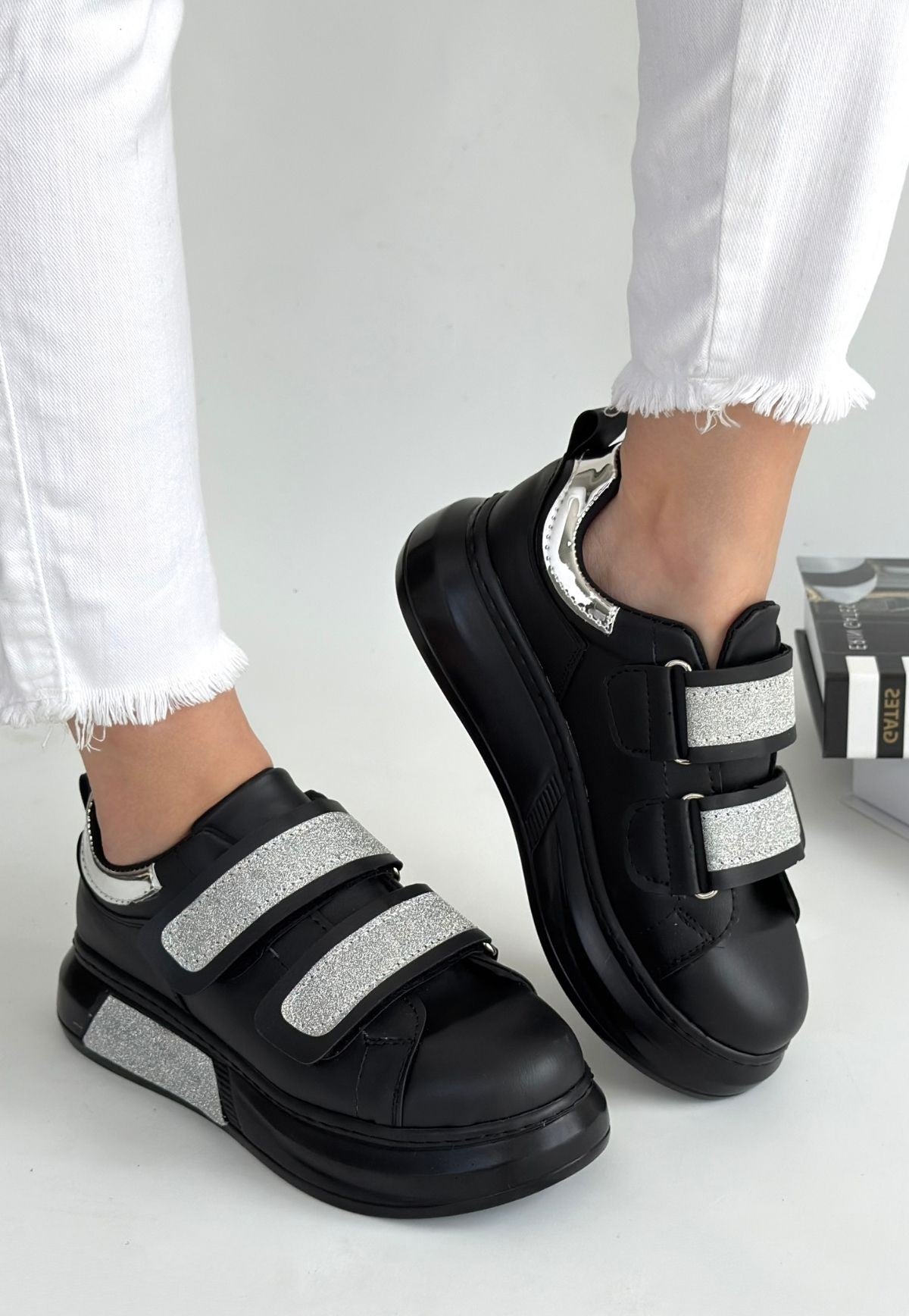 Nino Siyah Cilt Simli Cırt Cırtlı Spor Ayakkabı