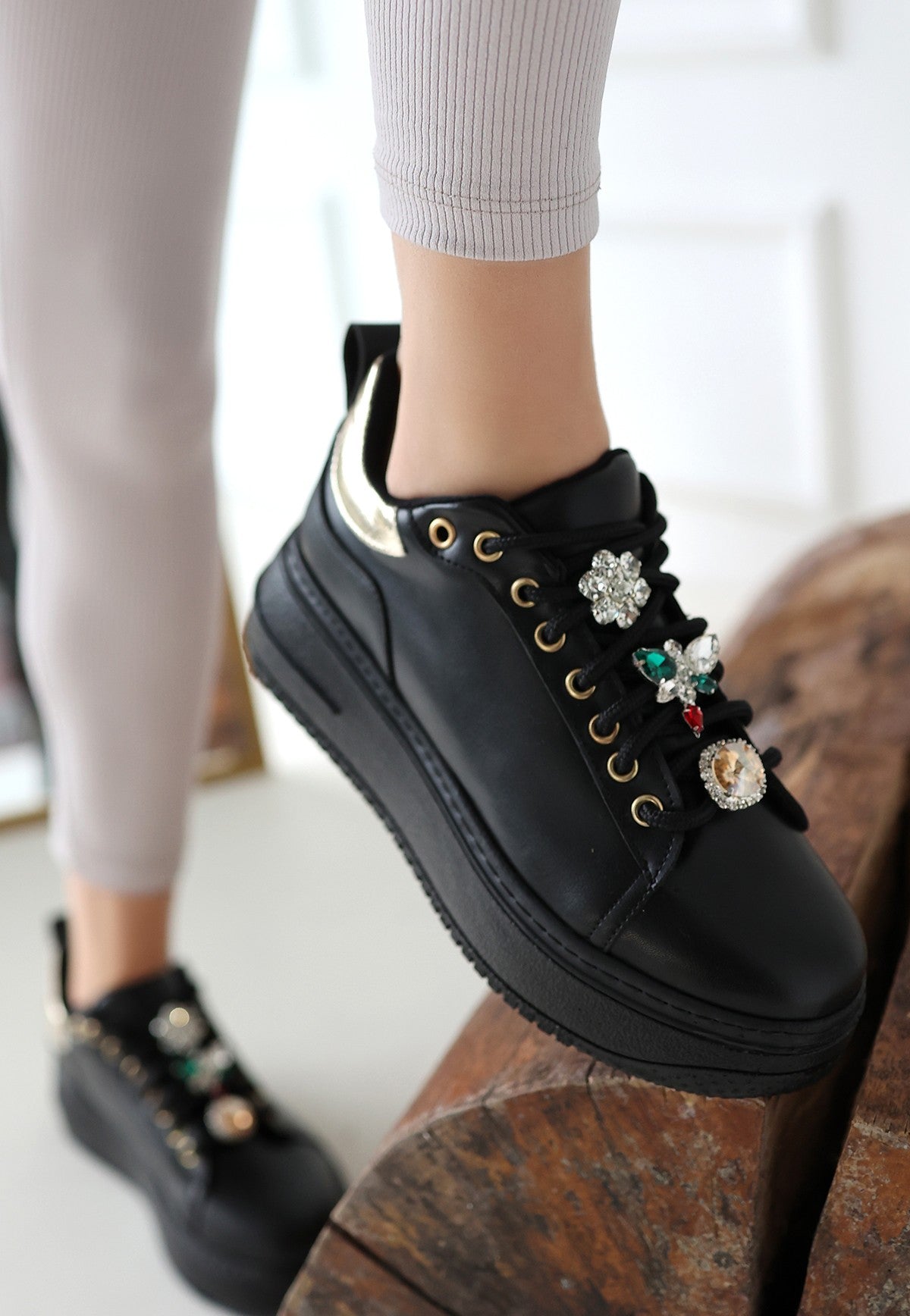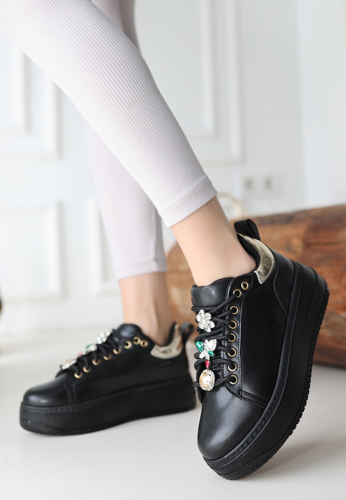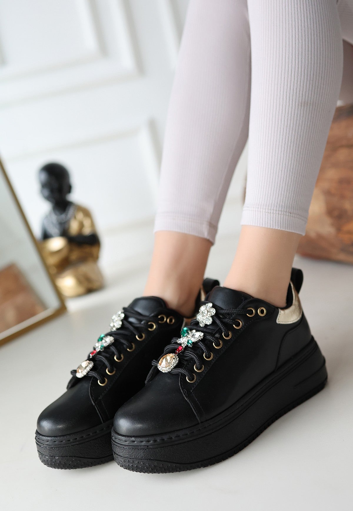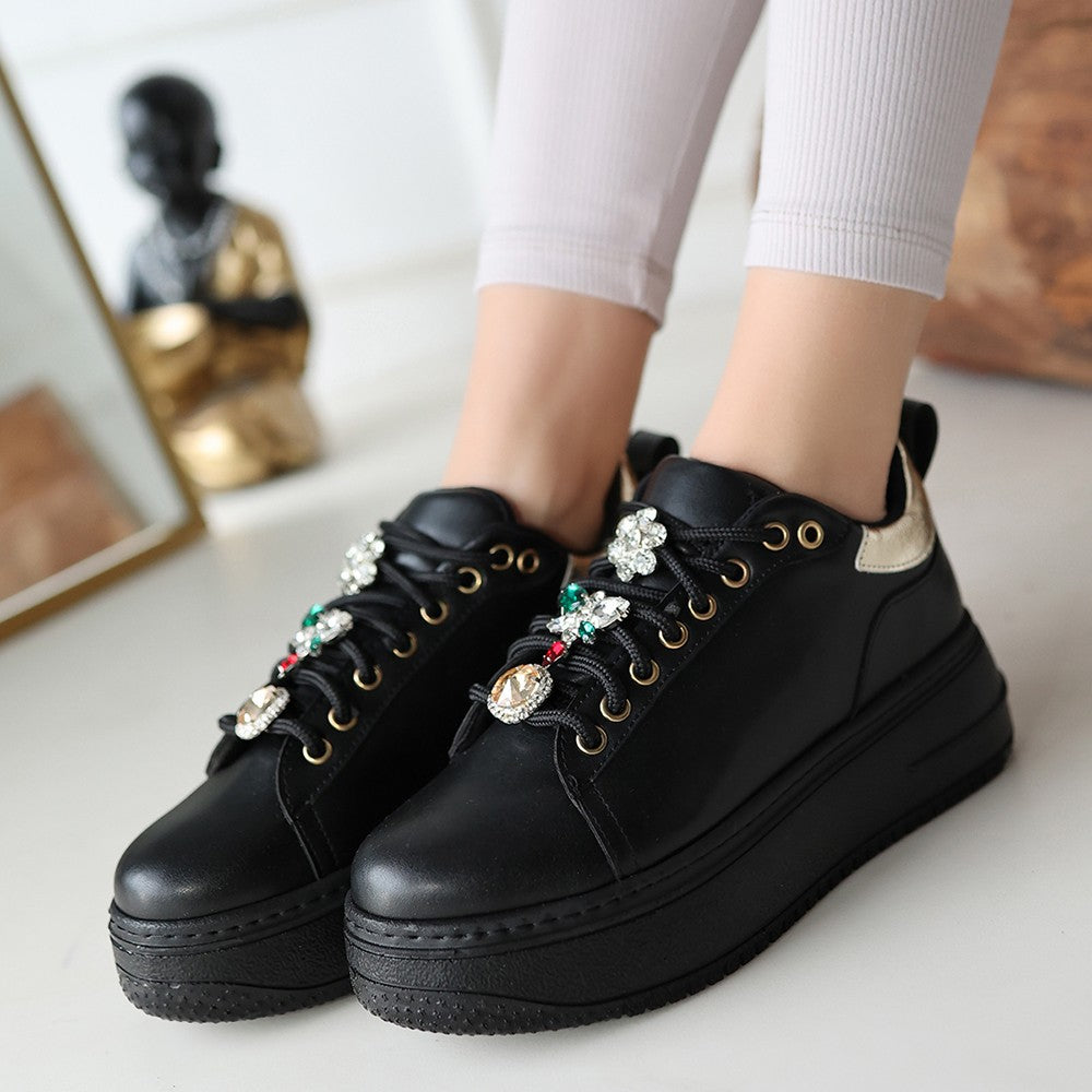 Detay: Bağcıklı Dolgu Topuklu Gold Detaylı Spor