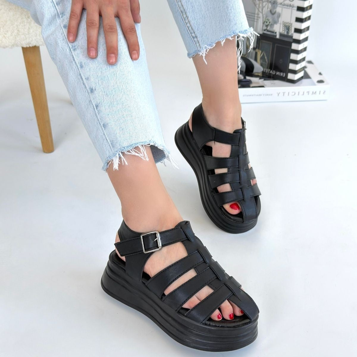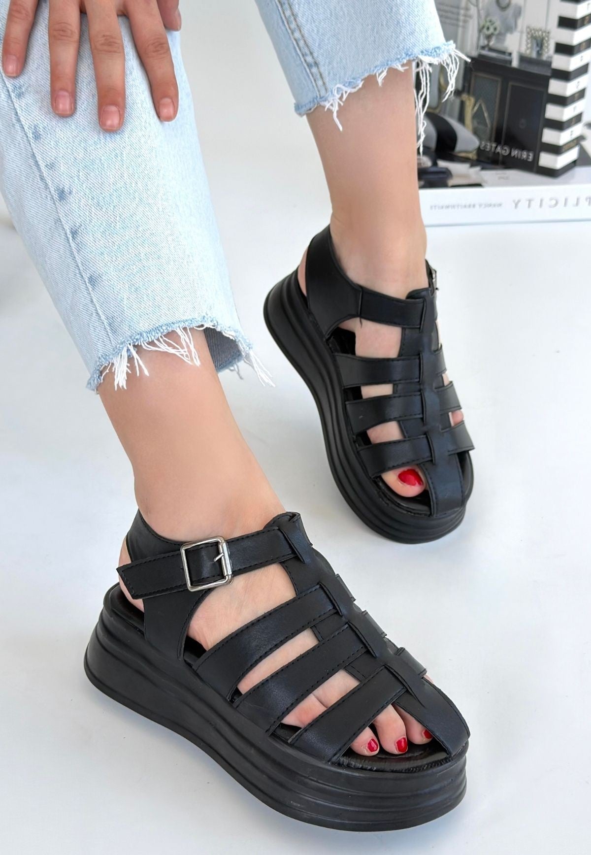 Toten Siyah Cilt Kemerli Sandalet
